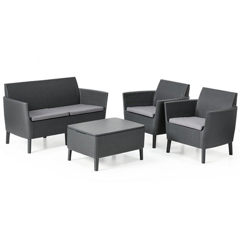 A Curver Salemo grafit kerti bútor négy ember számára nyújt helyet a pihenéshez. Magas kényelmet biztosít, amelyet befolyásolnak a puha üléspárnák, a jól profilozott háttámlák és a széles kartámaszok. A dohányzóasztal ideális az alapvető funkciójához, de további előnye, hogy rekeszként is felhasználható, amelybe friss levegőn pihenve el tudjuk helyezni azokat a tárgyakat, amelyeket kéznél akarunk tartani. Az üléspárnákat elrejtheti a ládaban télen vagy heves esőzések esetén. A Curver Salemo grafit kerti bútorokat egyedülálló formatervezés jellemzi, amelyet a skandináv stílus ihlette. Enyhe színű, grafit árnyalatokban, gazdaságos formában és minimalista alakja szinte bármilyen elrendezéshez alkalmazkodik, legyen az modern vagy hagyományos. Nemcsak a magán, hanem a kereskedelmi térben is felhasználható.